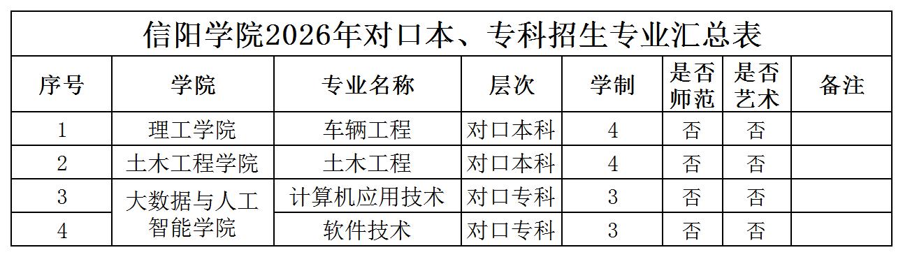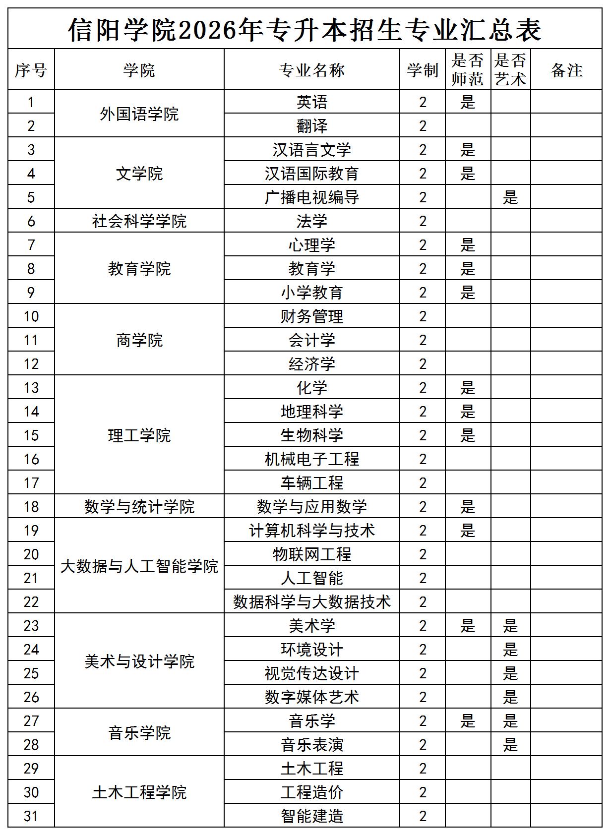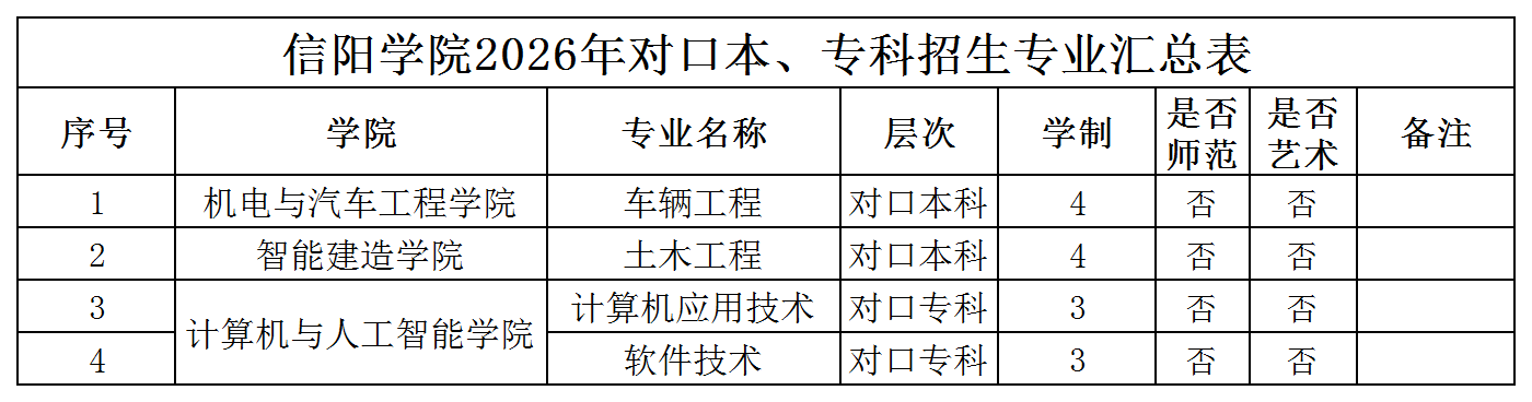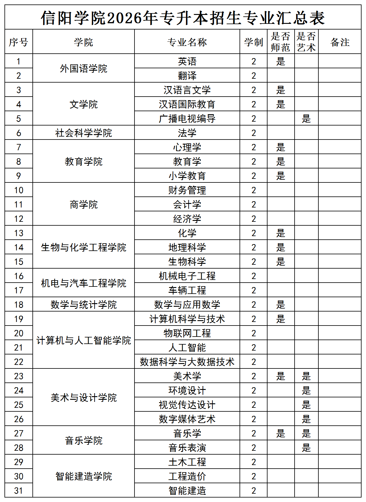 我校2026年面向全省招收专升本及对口本、专科考生。专升本涵盖英语、翻译、汉语言文学、汉语国际教育、广播电视编导等31个专业,招生代码:6518(普通专升本)、6548(退役士兵专升本)。对口本科招生专业有车辆工程、土木工程,对口专科招生专业有计算机应用技术、软件技术,对口招生代码:6508。欢迎各位考生报考。