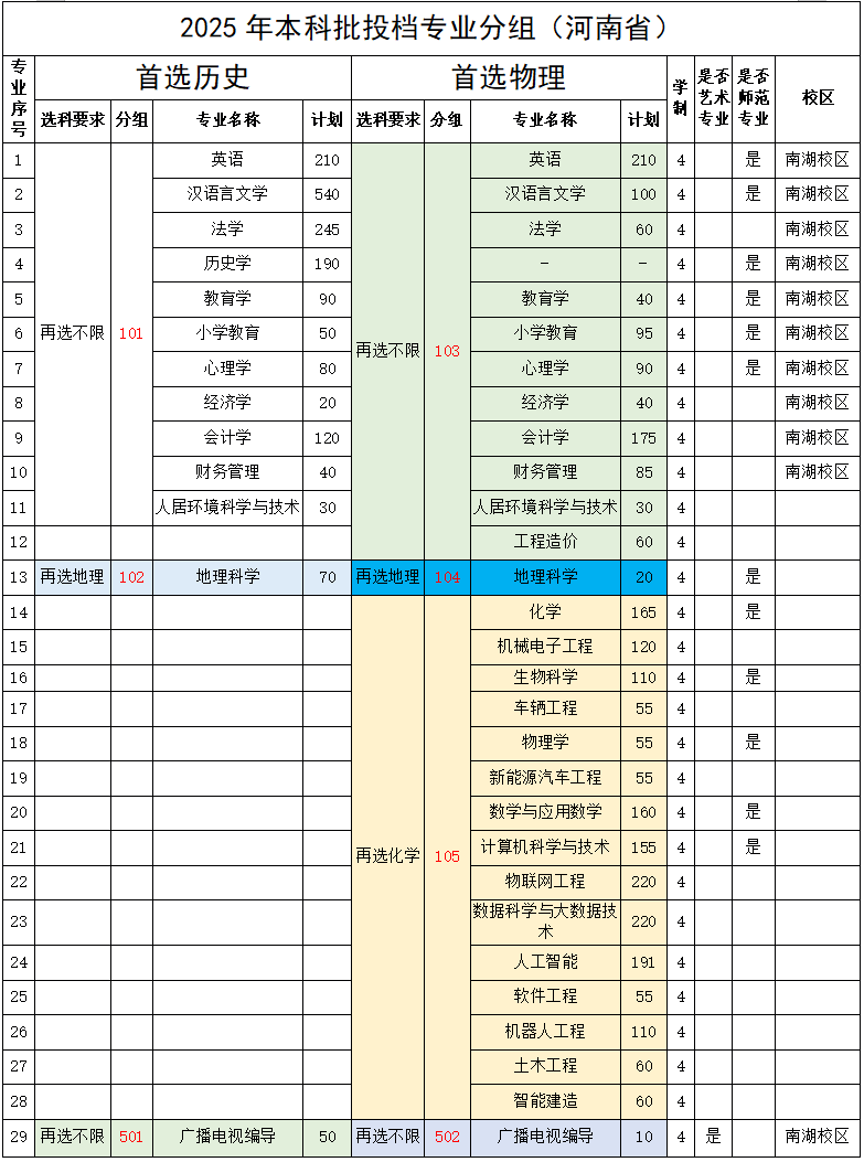 答:学校28个普通本科专业共分5个专业组,其中首选历史的2 个组(101 组历史+不限,共11个专业;102 组历史+地理,地理科学),首选物理的3个组(103组物理+不限,共11个专业;104组物理+地理,地理科学;105组物理+化学,15个专业)。1个艺术类专业(广播电视编导)分2个专业组(501组历史+不限;502组物理+不限)。